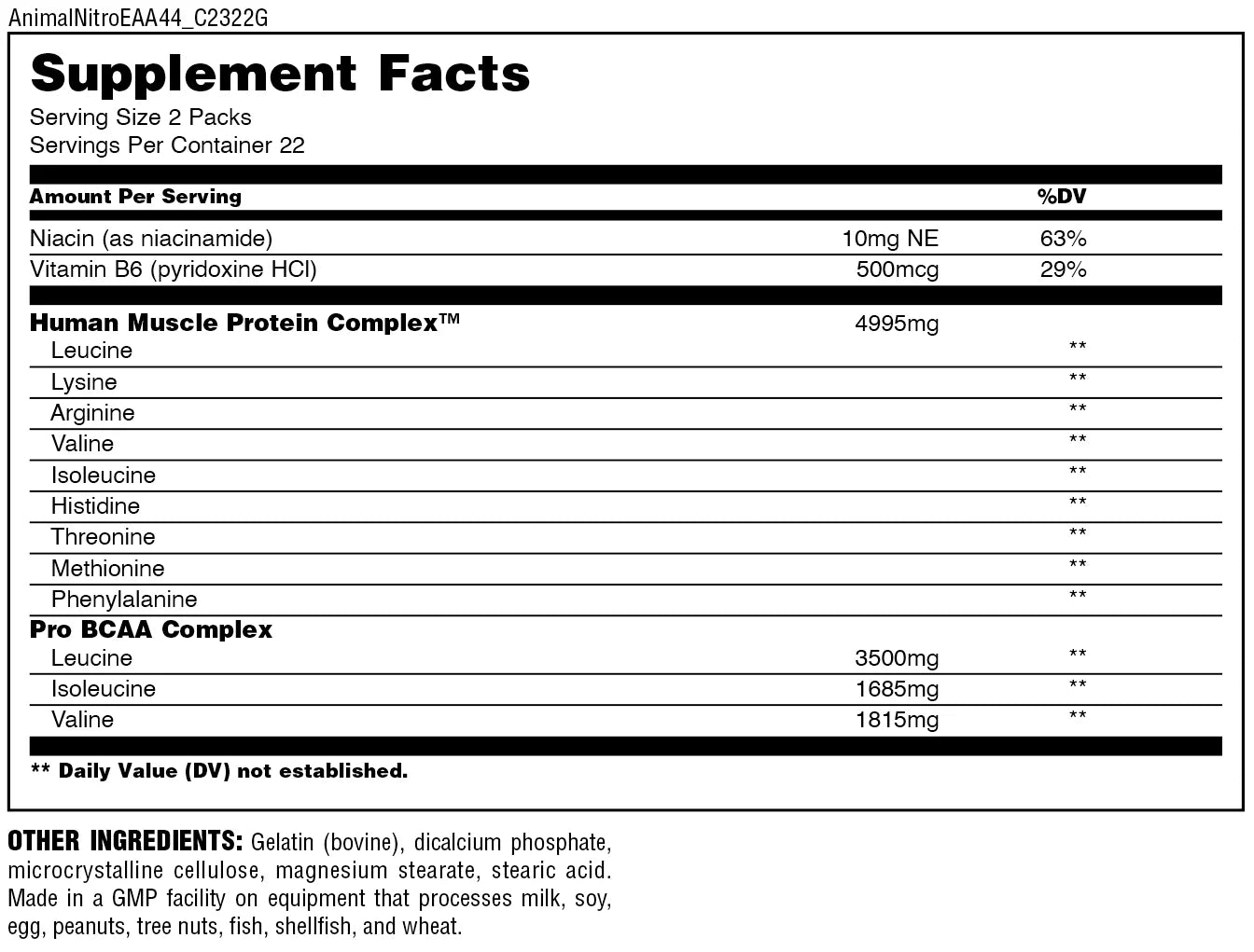 Each pack consists of a formula with a measured 6000 mg dose of uncoupled aminos. Once ingested, they quickly form a special bolus (a protective mass) that allows them to efficiently bypass the liver and enter systemic circulation, where they can exert their powerful effects. Animal Nitro uses ratios of specific and proven Essential Amino Acids (EEAs) that are modeled after human muscle tissues. This ensures superior and rapid absorption.