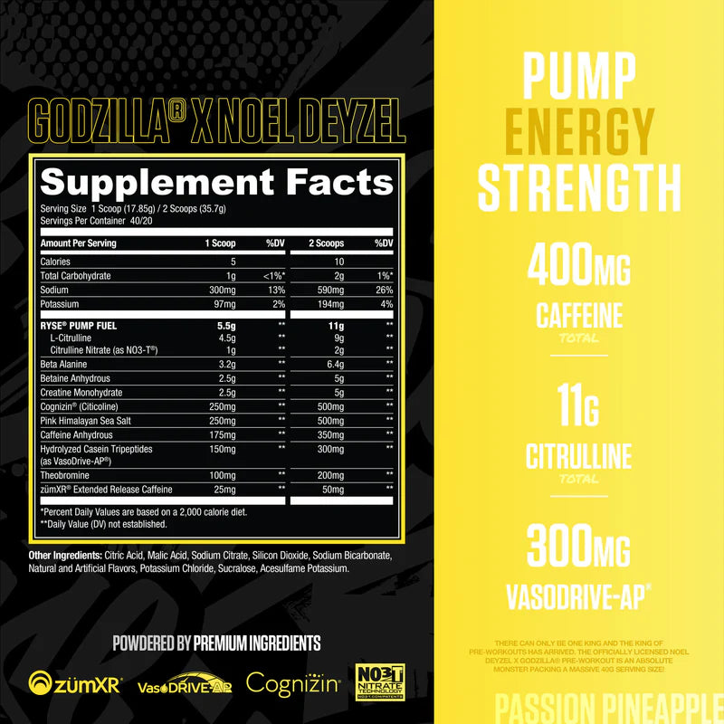 There can only be ONE King and the King of Pre-workouts has arrived. The officially licensed Noel Deyzel X Godzilla® Pre-Workout is an absolute monster. Packing a massive 40g serving size, this giant delivers city-crushing pumps, razor sharp focus & long-lasting explosive energy. Loaded with 12 ingredients, 5 clinically studied trademarks and a delicious blast of flavor, your new favorite pre-workout is ready for battle.